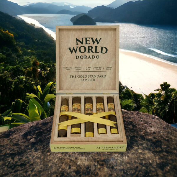 スパイス、土、コーヒーの香りが漂う、風味豊かなミディアムボディの煙草です。このニカラグア産ピューロは、黄金色の太陽栽培ハバノラッパーを使用しています。ニカラグアで手作りされたニューワールドドラドのラッパー、バインダー、そして一部のフィラータバコは、AJフェルナンデス氏のドラド農園で栽培されました。この農園は、黄金色の土地と豊かな土壌で知られています。ドラドコロナが加わることで、このラインには5種類の通常生産サイズが揃います。各サイズを1本ずつ購入したい方のために、以下のビトラが1本ずつ入った「ニューワールドドラド ザ ゴールドスタンダード サンプラー」をご用意しました。